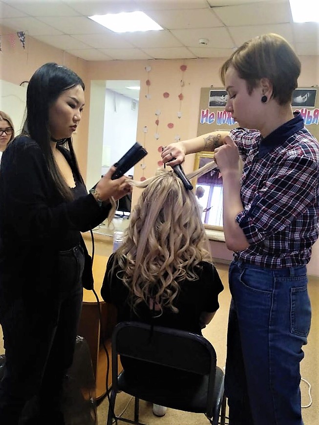 А пока участницы волновались и готовились к конкурсу, наши студенты подарили праздник их внучкам-болельщикам и всем гостям мероприятия: провели мастер-классы по прическам, заплели всем желающим красивые косы и сделали пышные локоны.