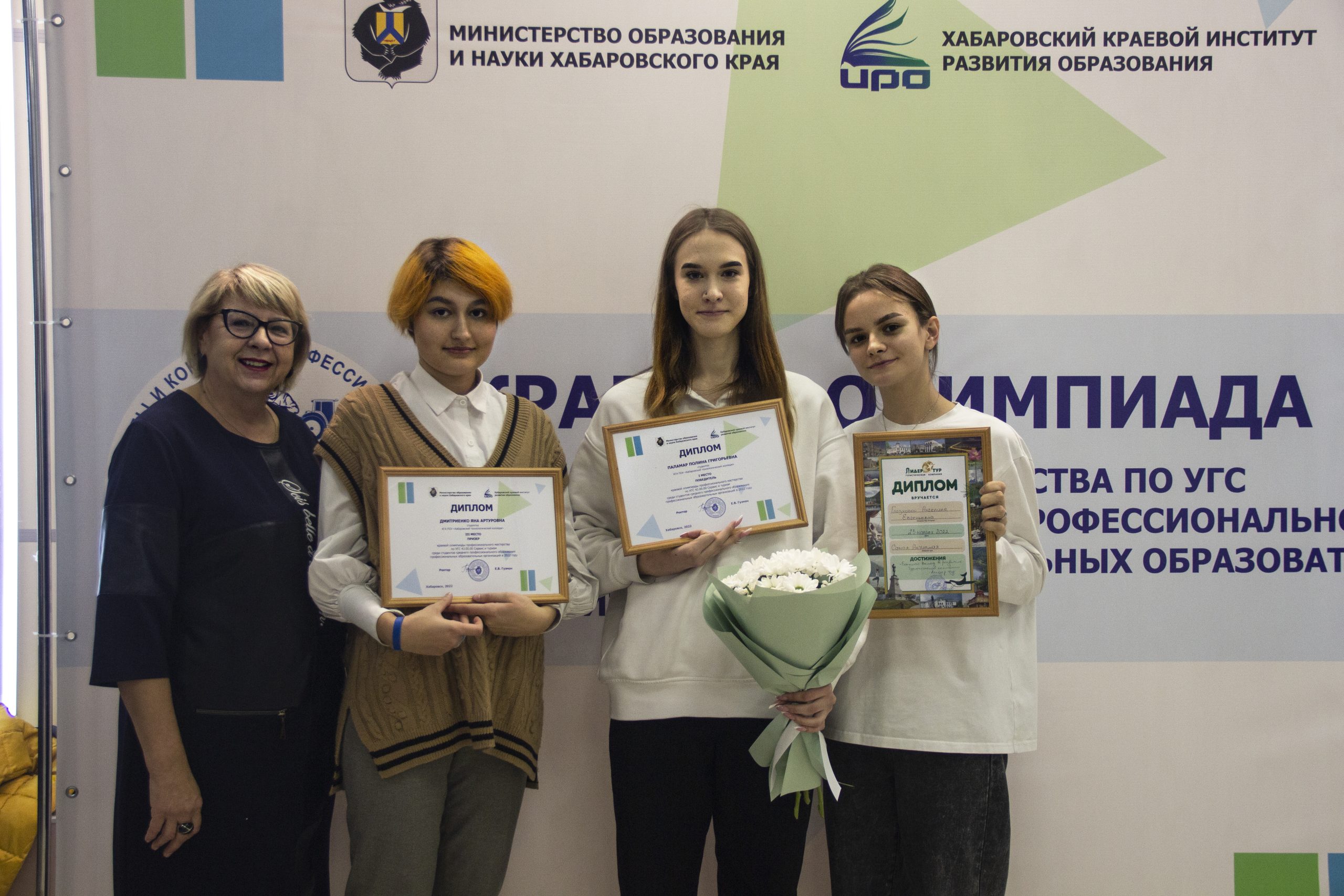 23-25 ноября 2022 года на базе краевого государственного автономного профессионального образовательного учреждения «Хабаровский технологический колледж» проходила краевая Олимпиада профессионального мастерства специальности 43.02.10 Туризм. Принимали участие в Олимпиаде студенты КГА ПОУ ХТК 421, 431 групп и студенты ККТИС г. Комсомольск-на-Амуре. 1 место заняла — Паламар Полина (КГА ПОУ ХТК), 2 место – Соседкова Валерия (ККТИС), 3 место – Дмитриенко Яна (КГА ПОУ ХТК).