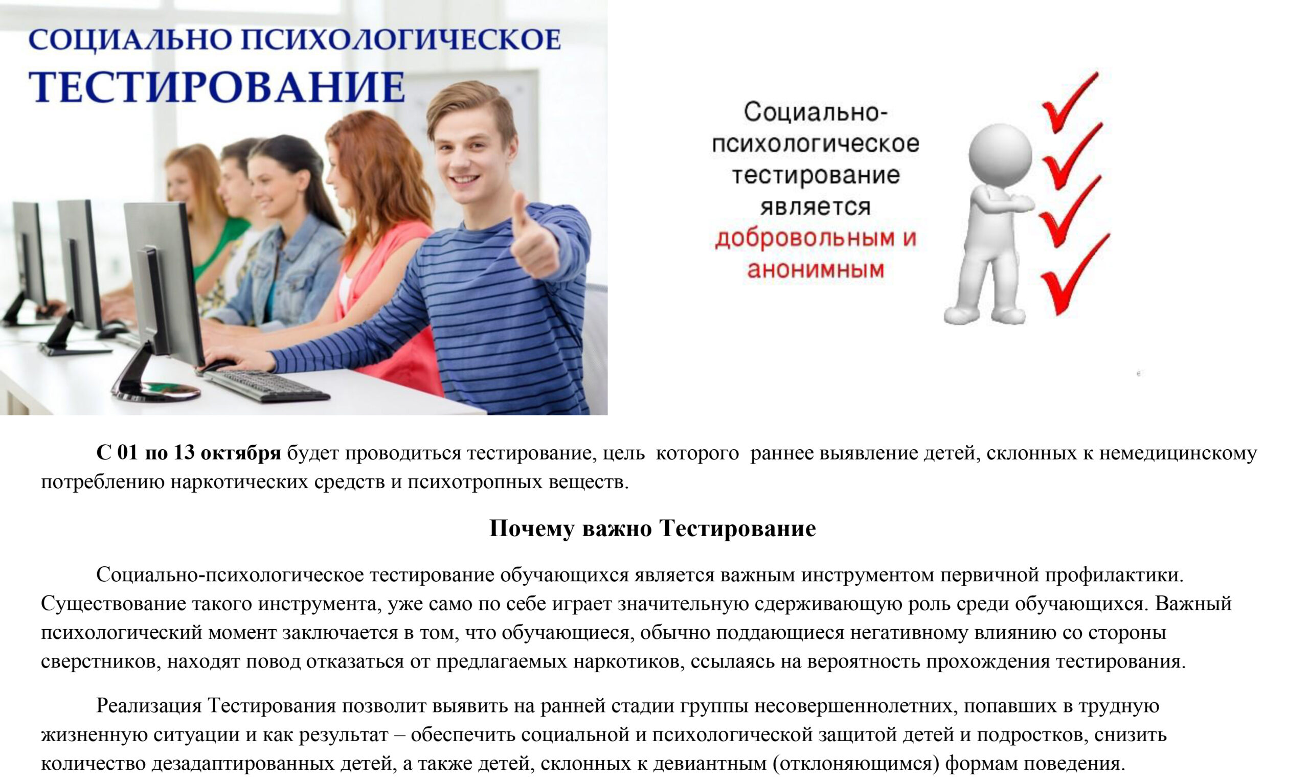С 01 по 13 октября будет проводиться тестирование, цель которого раннее выявление детей, склонных к немедицинскому потреблению наркотических средств и психотропных веществ.