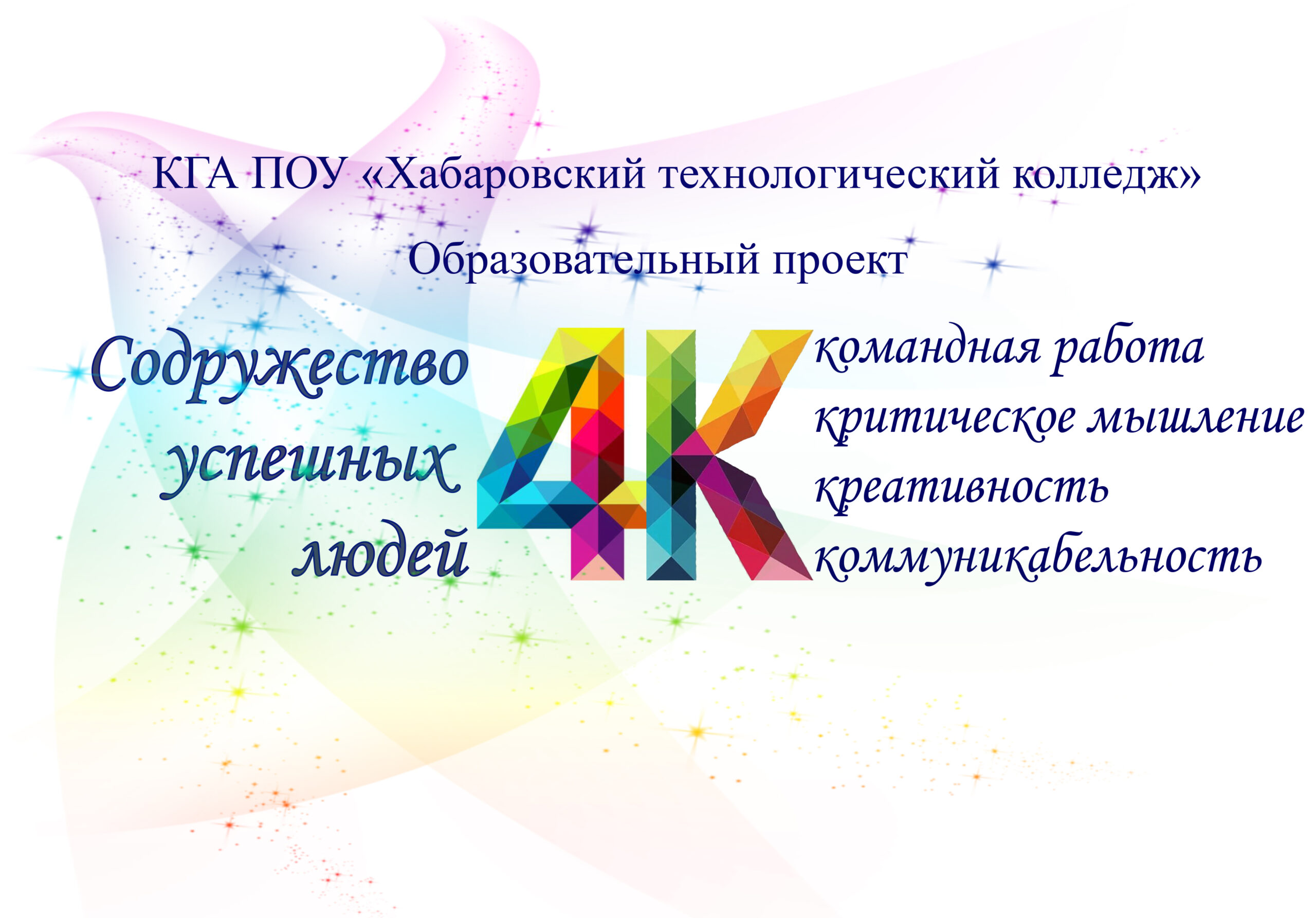 «Содружество успешных людей 4К». Состав его участников – студенты первого курса, которые готовы учиться работать в Команде, Критически мыслить, принимать Креативные решения, повышать уровень Коммуникабельности.
