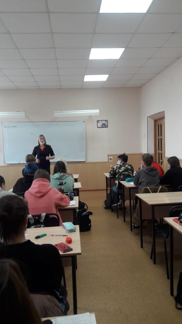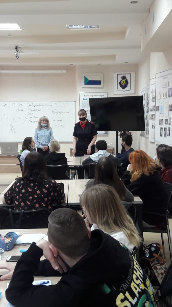 30 марта 2021 года в учебных группах 611, 311, 711, 811ПК, 211, 411 проведены беседы на тему «Административная и уголовная ответственность несовершеннолетних за совершение административных правонарушений и преступлений, Правила поведения на объектах транспорта, профилактика травматизма, ответственность за проведение и участие в несанкционированных митингах». Беседы провели старший инспектор ОПДН Хабаровского ЛУ МВД России на транспорте майор полиции Шадрина Т.С., главный специалист сектора по работе с детьми, молодежью и семьей Левченко И.А, начальник ОПДН ОП № 4 УМВД России по г. Хабаровску подполковник полиции Поповская Н.А.